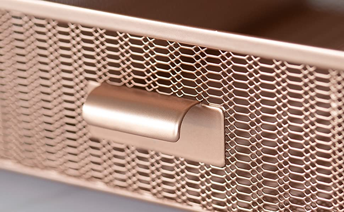 - MODERN, SPACE SAVING DESIGN: Organization does not have to be difficult. Made of metal finished in rose gold and featuring a unique mesh design, this Vertical and Horizontal File and supplies organizer with drawer and letter sorter keeps things organized and saves space.