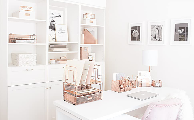 - PREMIUM QUALITY: Made of strong metal mesh and finished with rose gold paint, this File Organizer looks great on any desk! This all in one inbox organizer caddy will look great on a desk while also offering functionality and a modern look.