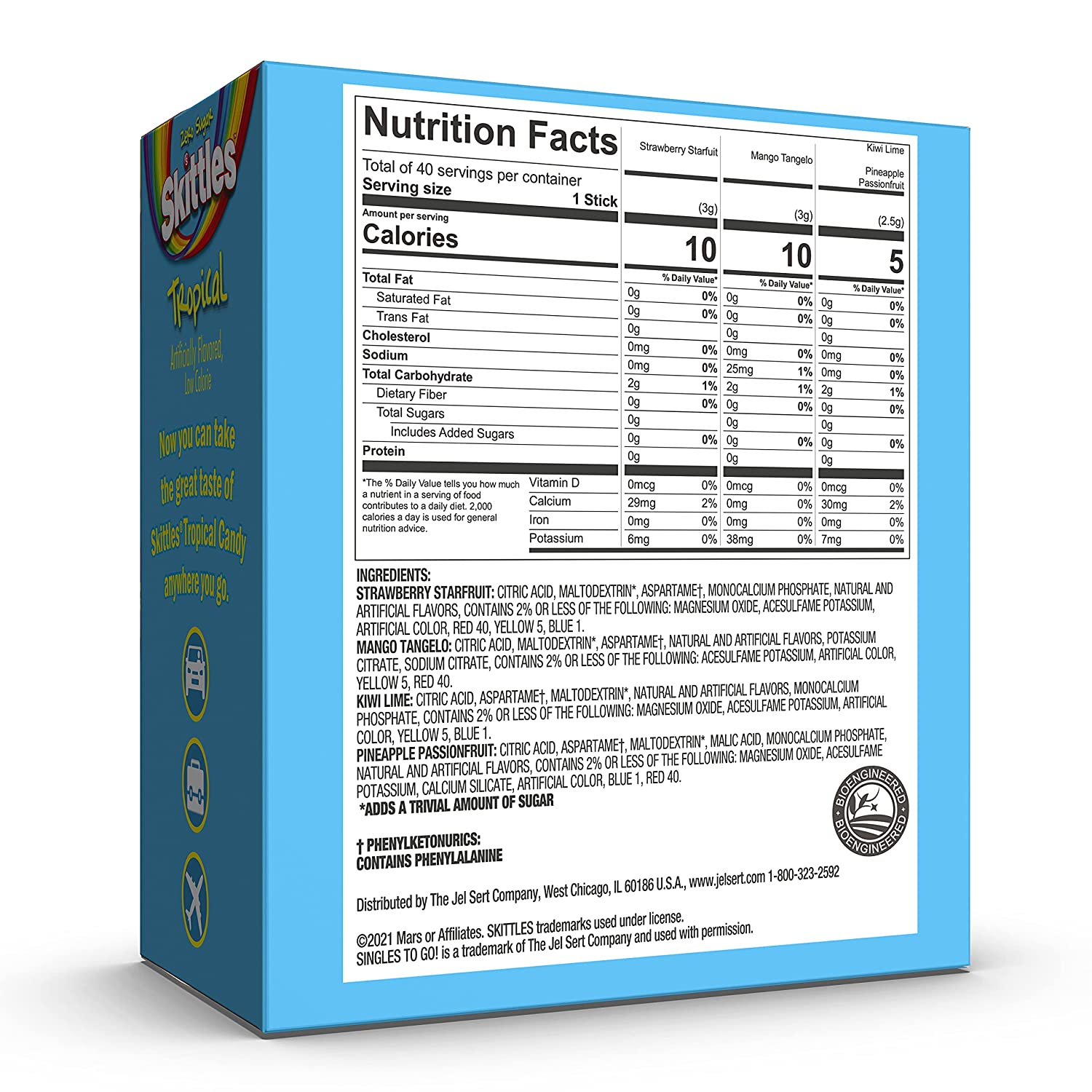 SKITTLES SINGLES TO GO –Now you can bring the taste of the rainbow with you anywhere, anytime! Skittles Singles To Go drink mix sticks are bursting with fruit flavor that will add tasty excitement to your water.