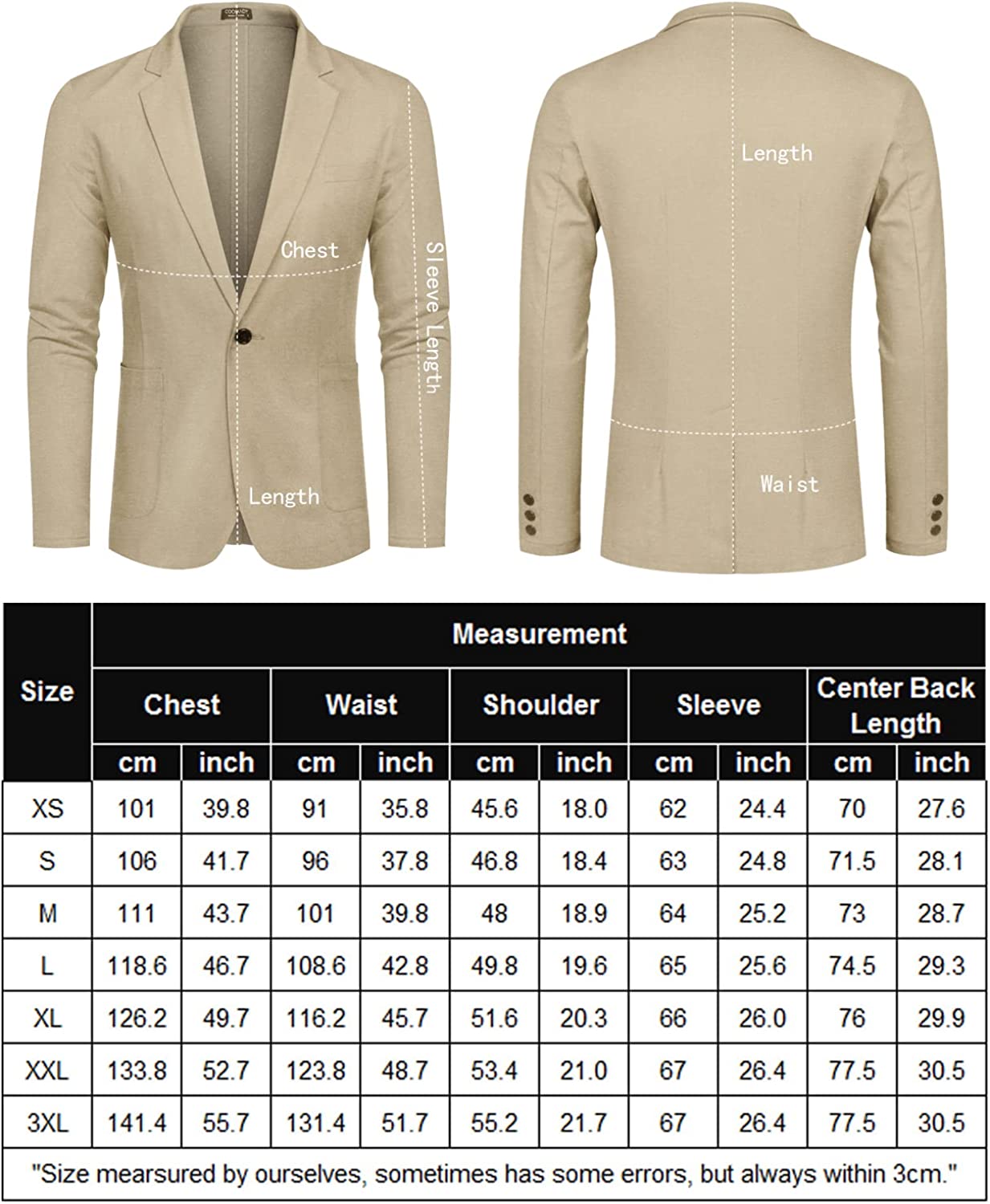 - 【NOTICE】1)Hand Wash/Dry clean. Our blazers are made of cotton and linen,in order to give you a better wearing experience, please iron before wearing. 2)When you first receive this men's travel jacket, the pocket is closed by some stitches. After cutting stitches, you can use the pocket. 3)Please check our size chart images in description part before ordering ( Not the Amazon size information).