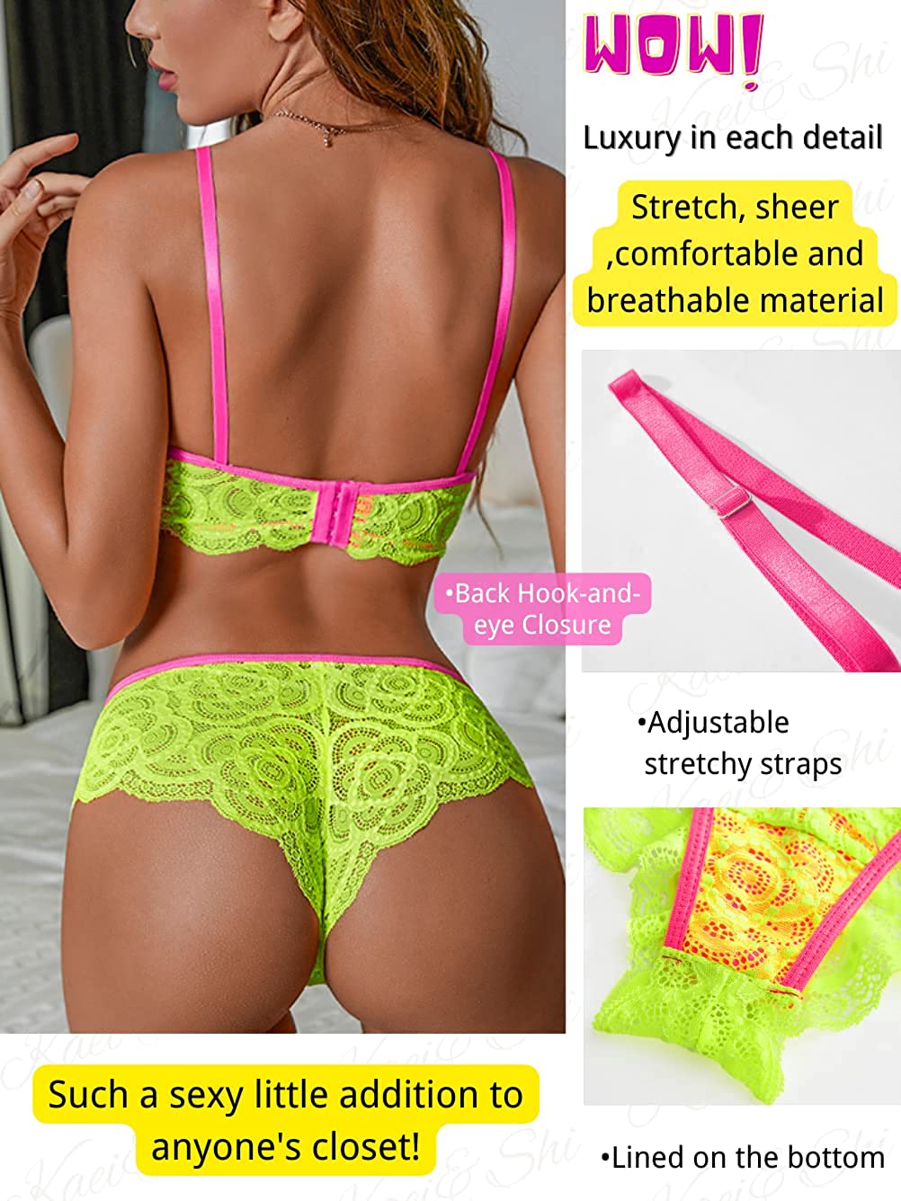 • ✿Feature: This matching bra and panty set is featured with fluorescent, two tone, bow detail, spaghetti strap, scalloped trim which shows your curve beautifully.