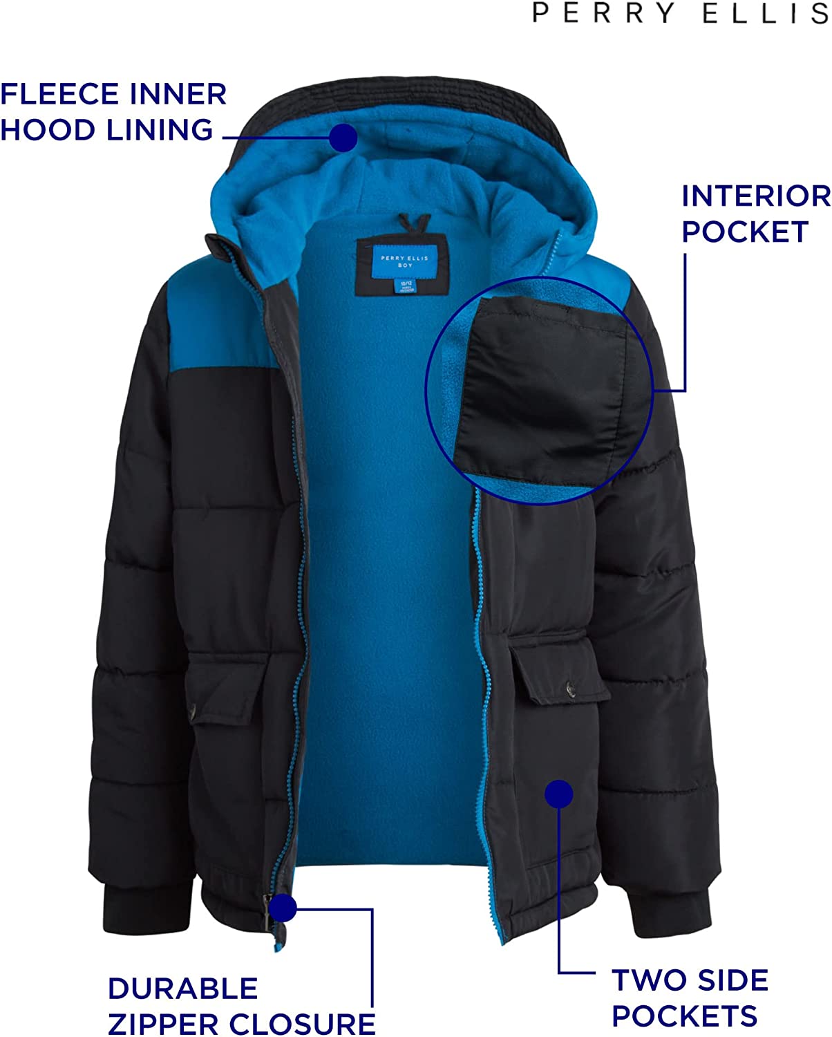 • OFFICIALLY LICENSED PERRY ELLIS: Boys' winter jacket; Perry Ellis makes versatile, of-the-moment clothes, designed with real life in mind, so they move better, clean better, travel well, and go the distance