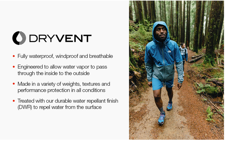 WATERPROOF FABRIC. Made with DryVent performance tech, this waterproof, windproof and breathable jacket delivers cozy comfort for casual nights or adventure days. Easy to care for and easy to wear, you'll love the effortless look and feel anywhere you go.
