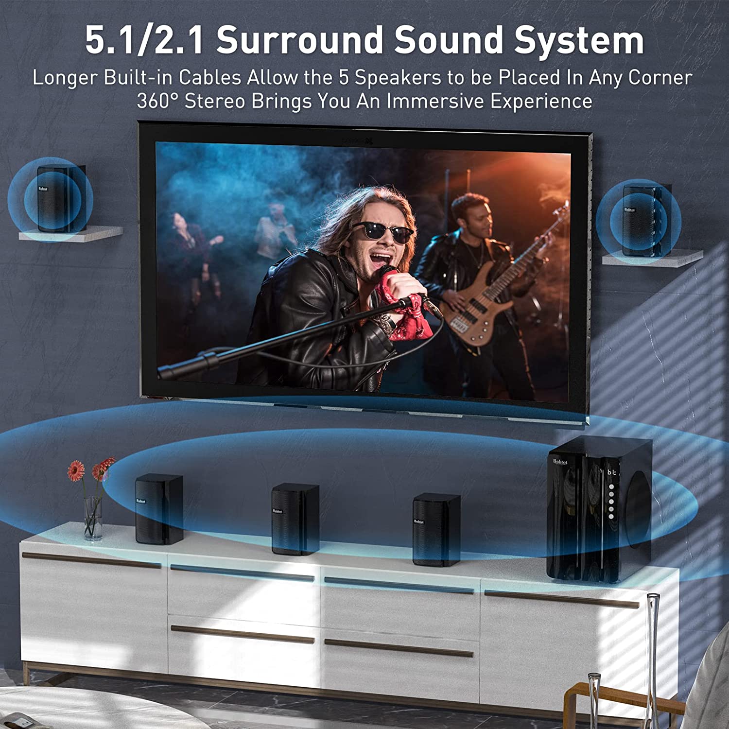 5.1 Channel Surround Stereo Sound: Bobtot Surround Sound System for TV has two modes of 5.1/2.1 channel, switch via remote control or front panel. Pro surround function provides you with more advanced enjoyment