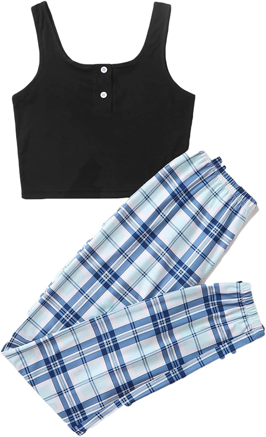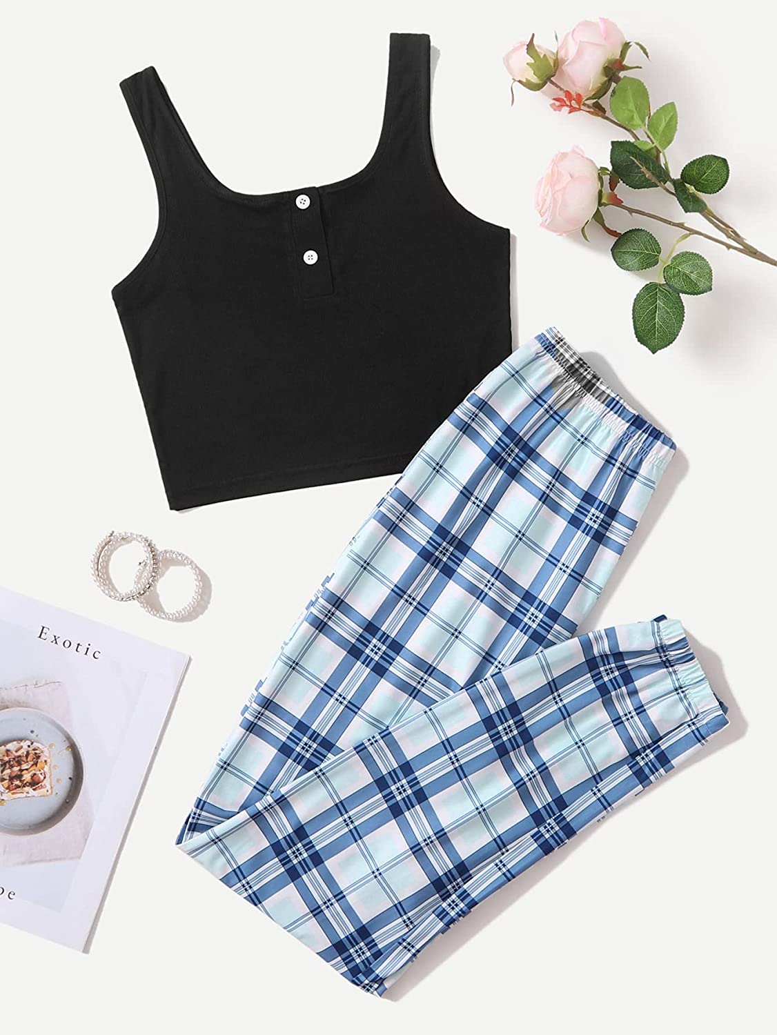 SheIn Women's 2 Piece Sleeveless Button Front Crop Tank Tops and Plaid Pants Pajama Lounge Set