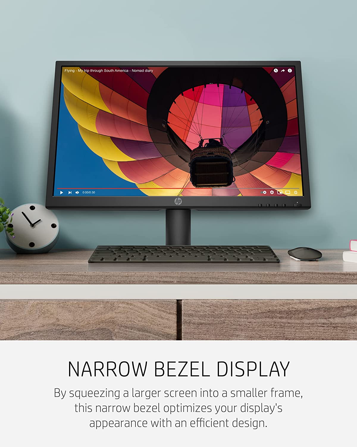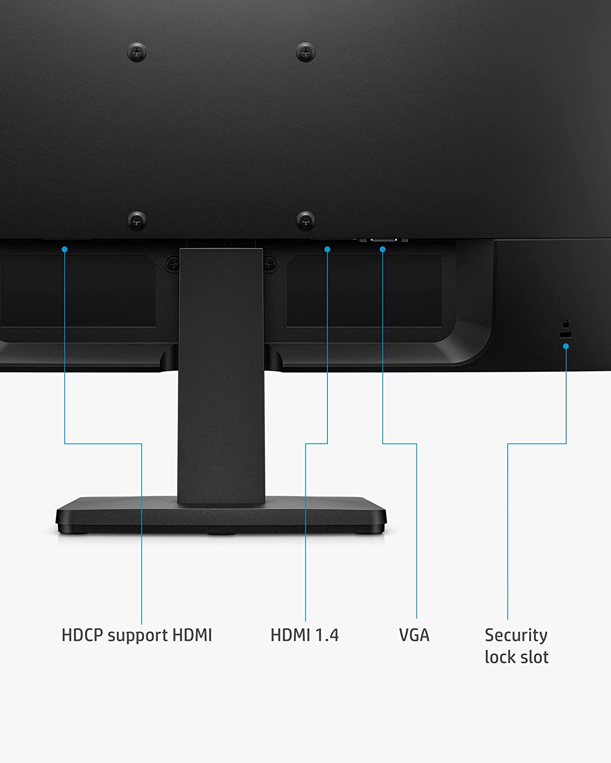 Browse the web, stream your shows, and get work done on the everyday HP V223ve FHD Monitor. This HP computer monitor’s 21.5-inch Full HD screen boasts unparalleled visuals every time you turn it on (1). What’s more is that the 1080p monitor features a 75Hz refresh rate for smoother images, plus a superb contrast ratio for better color differentiation (2). No matter where you view your HP monitor, the VA panel ensures image clarity is maintained across ultra-wide 178-degree horizontal and vertical viewing angles. Easily connect a laptop, an external storage drive, or an additional monitor with the HDMI and VGA ports. Get the most out of a PC monitor designed for both comfort and efficiency. The TÜV certified Low Blue Light Mode limits the strain put on your eyes, while the tilt-adjustable display ensures comfortable posture all day. Beyond this HDMI monitor’s comfort settings, the narrow bezel design keeps things stylish and productive, letting you see more of your favorite show or word document. Customize your display with ease thanks to the intuitive HP Display Center software; through the host PC, you can personalize every little detail from display settings, screen partitioning, and even dimming the screen. Further customize the way you use this monitor with standard 100 x 100 millimeters VESA mounting options (3). This 75Hz monitor’s energy-efficient design isn't just for you but the environment too, as your device reduces power consumption and energy costs. Plus, the materials used in the packaging are 100% sustainably sourced and recyclable (4). Rest easy as your monitor is covered by an HP 1-year limited hardware warranty. (1) Full high-definition (FHD) content is required to view FHD images. (2) During video playback only, depending on series of frames or time duration. (3) Bracket not included. (4) 100% outer box/corrugate cushion packaging made from sustainably sourced certified and recycled fibers. Fiber cushions are made from 100% recycled wood fiber and organic material. Excludes plastic bags and plastic foam sheeting. 06/04/2021_r1 tg.