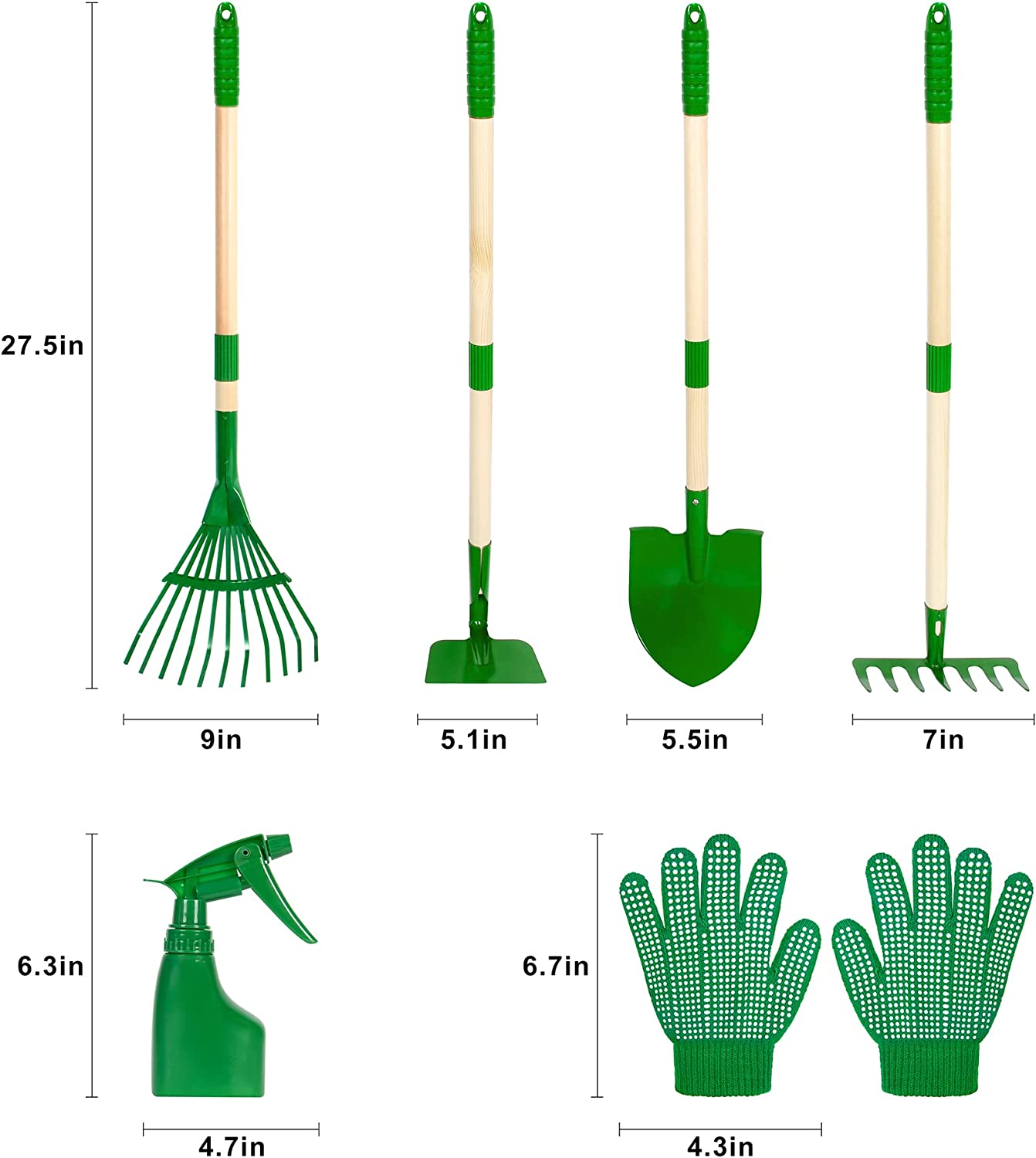 • 6 PCS KIDS GARDEN TOOLS: Toddler gardening tools set include Shovel, Rake, Hoe, Leaf Rake, kids custom gloves and a spray bottle (3 morphological transformations). Children's custom gloves are perfect for protecting their hands from injury while gardening activities!
