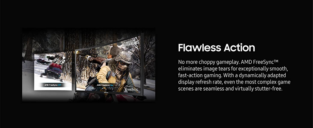 Samsung CRG5 Curved Gaming Monitor allows gamers to get fully immersed in with the1800R curved screen. No matter what you are playing, get the feeling of being pulled in as your game's world wraps around you, and enjoy smooth and clear action every moment. A refresh rate of up to 144Hz puts you ahead, even in the most demanding games. Spot the enemy instantly and notice tiny crucial changes in every scene. Get ideal settings for your game with exclusive gaming features. Game Mode optimally adjusts black gamma levels, contrast, sharpness, and color for any game genre. Low Input Lag Mode minimizes delays between your input devices and display. Virtual Aim Point centers the target on the screen for more precise attacks on the enemy. No more choppy gameplay. AMD Radeon FreeSync™ eliminates image tears for exceptionally smooth, fast-action gaming. With a dynamically adapted display refresh rate, even the most complex game scenes are seamless and virtually stutter-free. Play for even longer. Eye Saver Mode minimizes blue light enough to keep eyes relaxed and comfortable when gaming for extended periods. Flicker Free technology continuously removes tiring and irritating screen flicker so you can focus longer with less distraction or eye strain. Give them nowhere to hide. A whopping 3000:1 contrast ratio lets you see dangerous objects or enemies with greater clarity. Blacks are deeper and whites are brighter with more levels of shades in between. Even when enemies hide in the dark, you can spot them quickly, before it's too late.
