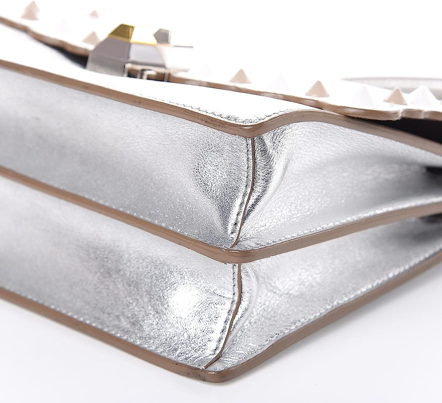 This shoulder bag is crafted of smooth calfskin leather in metallic silver with scalloped edges. This shoulder bag features a long polished silver-tone chain link strap with a shoulder pad and silver rings on the anchor to hold bag charms. The front flap has a decorative pyramid stud closure. The front opens to a partitioned grey suede interior with a patch pocket. This handbag is perfect for day or evening use, from Fendi!