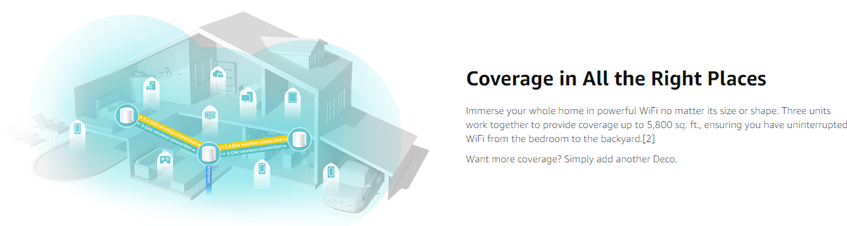 With clearer and stronger signals enhanced by BSS Color and Beamforming, Deco X20 boosts broader whole home Wi-Fi up to 5,800 ft2 (3-pack). Wireless connections and optional Ethernet backhaul work together to link Deco units, providing even faster network speeds and truly seamless coverage. Want more coverage? Simply add another Deco.