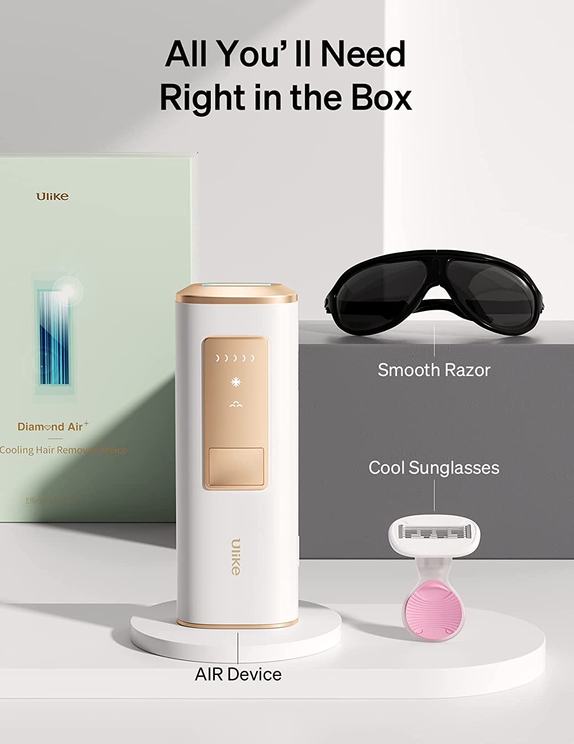 • What’s in the Box - Get fantastic results right from your sofa. Ulike Sapphire Air includes the Device, Razor, and Sunglasses. It’s all you’ll need to look and feel your best throughout the seasons.