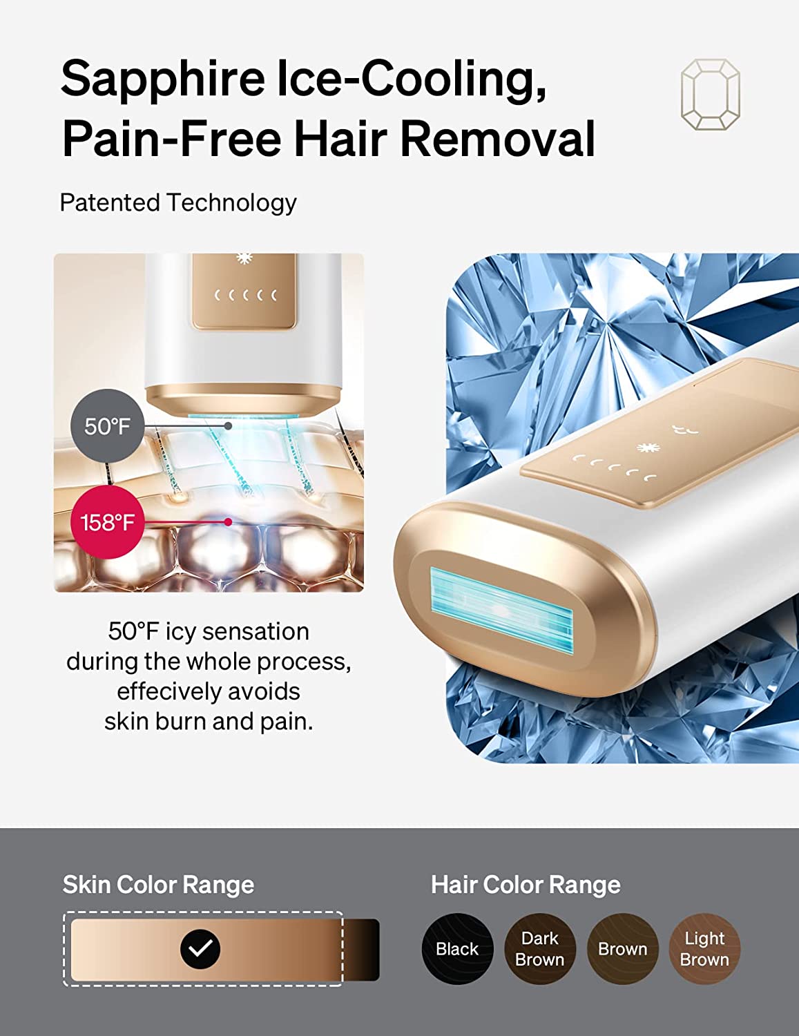 • Industry-leading Cooling Technology - Get silky-smooth results without the pain. Ulike adopts clinical-grade sapphire ice-touch technology to lower the epidermis from 158℉ to 50℉ at the point of contact with your skin, avoiding high-temperature burns and epidermal thermal damage.