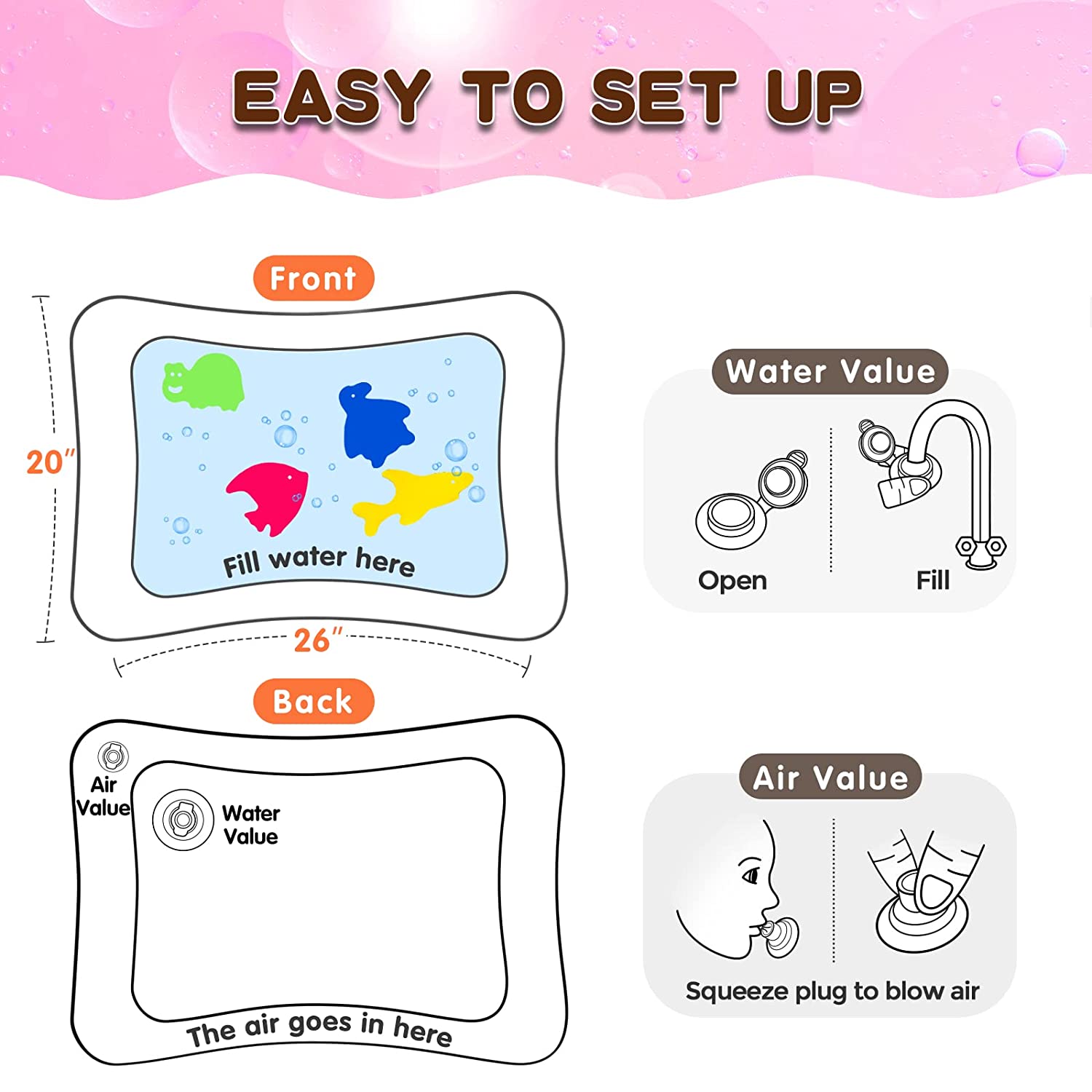 Perfect gift for babies: Sometimes baby may hate tummy time. This water fill playmat keeps your baby boy or girl's interest riveted, making tummy time easy and fun for your little sweetie. The baby splash water sensory pad has an ideal 26 x 20-inch size that provides a large roomy play size area, perfect baby toys for 3 6 9 12 months.