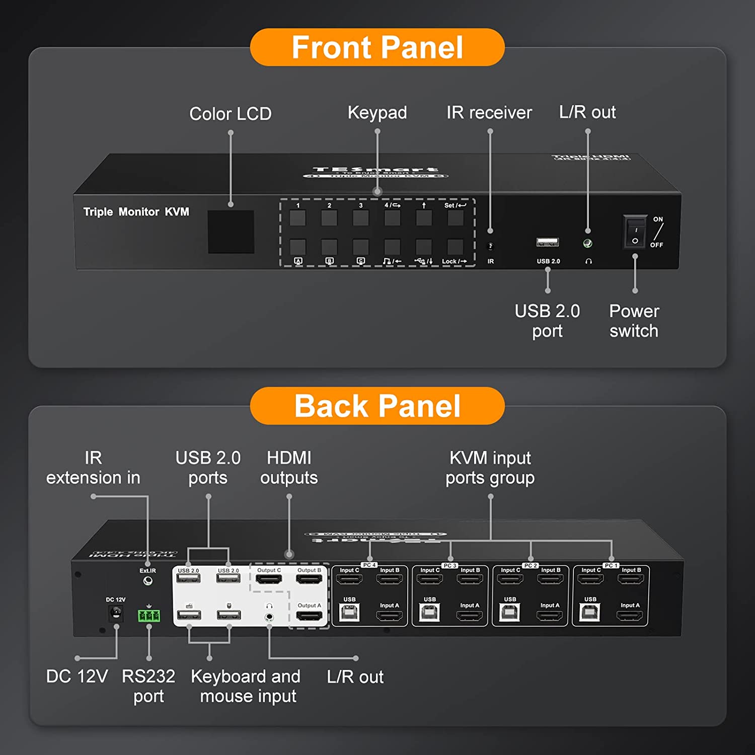 【TRIPLE MONITOR KVM SWITCH WITH 2 DISPLAY MODES】Hooking 4 desktops or Laptops to share one set of keyboard, mouse and 3 monitors for extended display or duplicate display or display different PCs on 3 monitors. Each computer needs to have 3 video connection to the triple monitor HDMI KVM.
