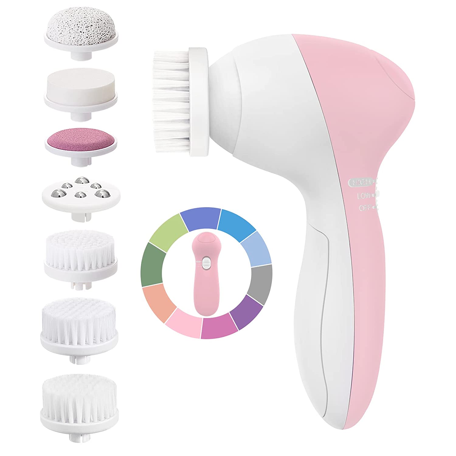 AII IN ONE CLEANSING SYSTEM: This facial cleansing brush contains 2 bristle brush heads of different sizes,1 silicone brush head,1 pumice stone, 1 makeup remover sponge, 1 rolling massage brush head, 1 exfoliating brush head , for a total of 7 brush heads, suitable for all skin types including sensitive skin, which can meet a variety of cleansing and skincare needs including fades acne marks, remove blackheads, deep pore cleansing, makeup removal and more