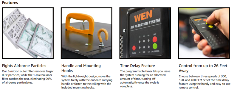 Remember when your workshop was full of clean air? Air-borne dust particulates can dirty up a woodworker's workshop and harm a healthy respiratory system, but with the WEN 3-Speed Remote-Controlled Air Filtration System, you no longer need to worry. This system eradicates these contaminants by catching them in one of the two easily cleanable filters while circulating the air in your work area. The powerful 1/6 HP motor leaves no stone unturned, collecting every contaminant in its path. Quiet system creates 50 to 60 dB of noise and is controllable up to 26 feet away with the included remote. The lightweight design weighs in at a mere 31 pounds. Combine this with the attached carrying handle and eyebolts for easy mobility, mounting and installation. The WEN Air Filtration System collects and releases the air in your workshop after filtering it through both a 5-micron outer filter and a 1-micron inner filter. Easily switch between three speeds of 300, 350 and 400 cfm depending on what the situation calls for. With the time feature, you don't even have to worry about turning off your machine. Simply set the timer and the machine will turn off on its own once the time runs out, allowing you to easily give your workshop a thorough cleanse at the end of a day of woodworking without having to be present. And because this is a WEN Product, your 3-Speed Remote-Controlled Air Filtration System is backed by a two-year warranty, a helpful customer service phone line, and a nationwide network of experienced technicians. Remember when you could breathe easy in your workshop? Remember WEN. Sound Output: 50-60 dB.