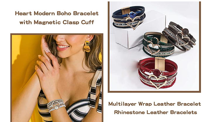 Long tiantian Multilayer Wrap Leather Bracelet Heart Modern Boho Bracelet with Magnetic Clasp Cuff Rhinestone Leather Bracelets for Women