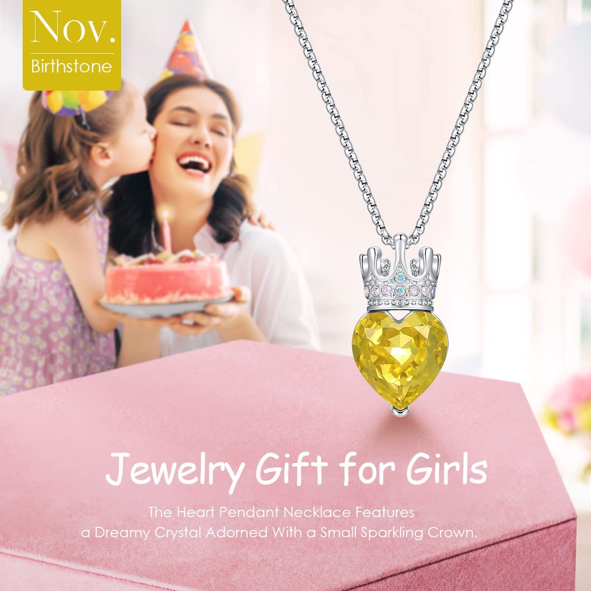 CROWN HEART NECKLACE: The heart pendant necklace features a dreamy crystal adorned with a small sparkling crown. The graceful crowned heart design expresses that your little girl is a beautiful, kind-hearted, independent and loving little princess.