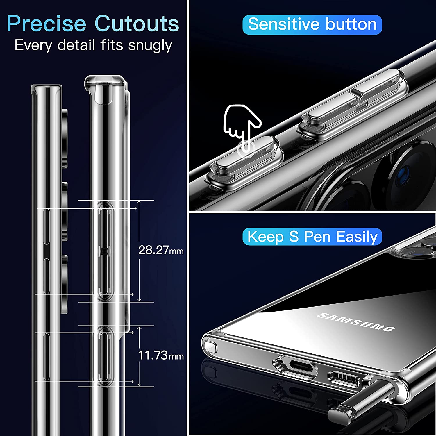 - ?[100% Crystal Clear & Never Yellow]: This crystal clear case is designed for Samsung S22 Ultra, fully shows the original beauty of your new Galaxy. After researching day and night select adopts upgraded Germany Top Bayer Material and Antioxidant molecule Layer to keep the long-lasting clarity than other. Shinning the beauty of your Galaxy all the time.
