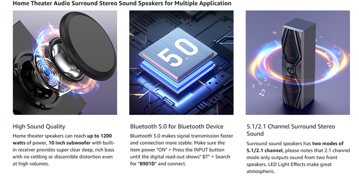 - 5.1 Channel Surround Stereo: Stereo system speaker has two modes of 5.1/2.1 channel, switch via remote control or front panel of the subwoofer. Pro surround function provides you with more advanced enjoyment.