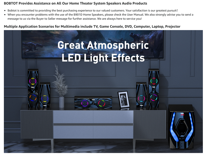 - Great LED Ambient Light Effect: The surround sound system speakers use high-quality materials, with LED lighting effect which makes full of atmosphere. The Subwoofer unit has 4 LED lighting modes: (blink to the beat, solid on, spectrum EQ analyzer, off).