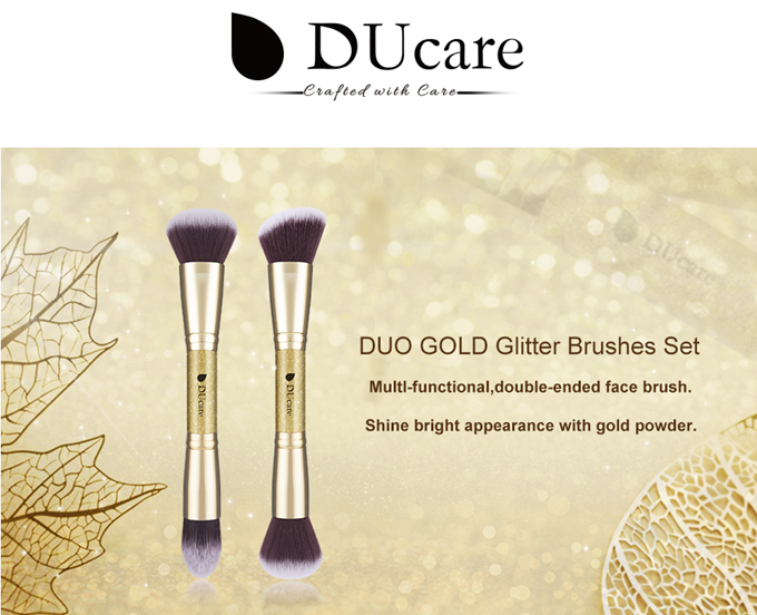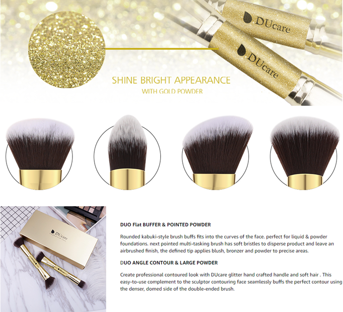 - Duo angle contour & large powder: Create professional contoured look with DUcare glitter hand crafted handle and soft hair . This easy-to-use complement to the sculptor contouring face seamlessly buffs the perfect contour using the denser, domed side of the double-ended brush.