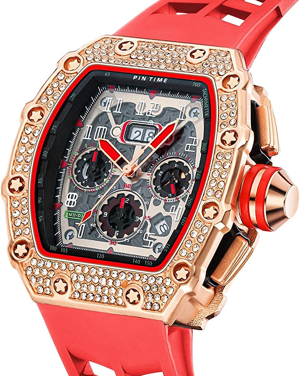 ❤️️ Fashion Unique Design ❤️️ : Big face luxury watch for men, 44mm diameter Domineering oak barrel case accommodate the chronograph sub-dial, calendar window below 5 o'clock, Shiny iced-out bezel , Making the watch design more vibrant. Suitable for many indoor & outdoor scenes.