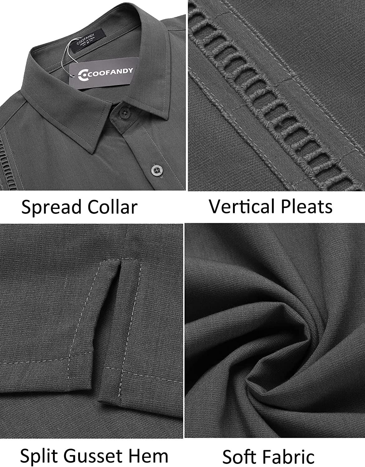 - DISTINCTIVE GUAYABERA - This guayabera shirt features spread collar, short sleeves, solid color, buttoned placket, vertical pleats, split hem gusset, straight hem. Considerate details of design bring you pleasure wear feeling.