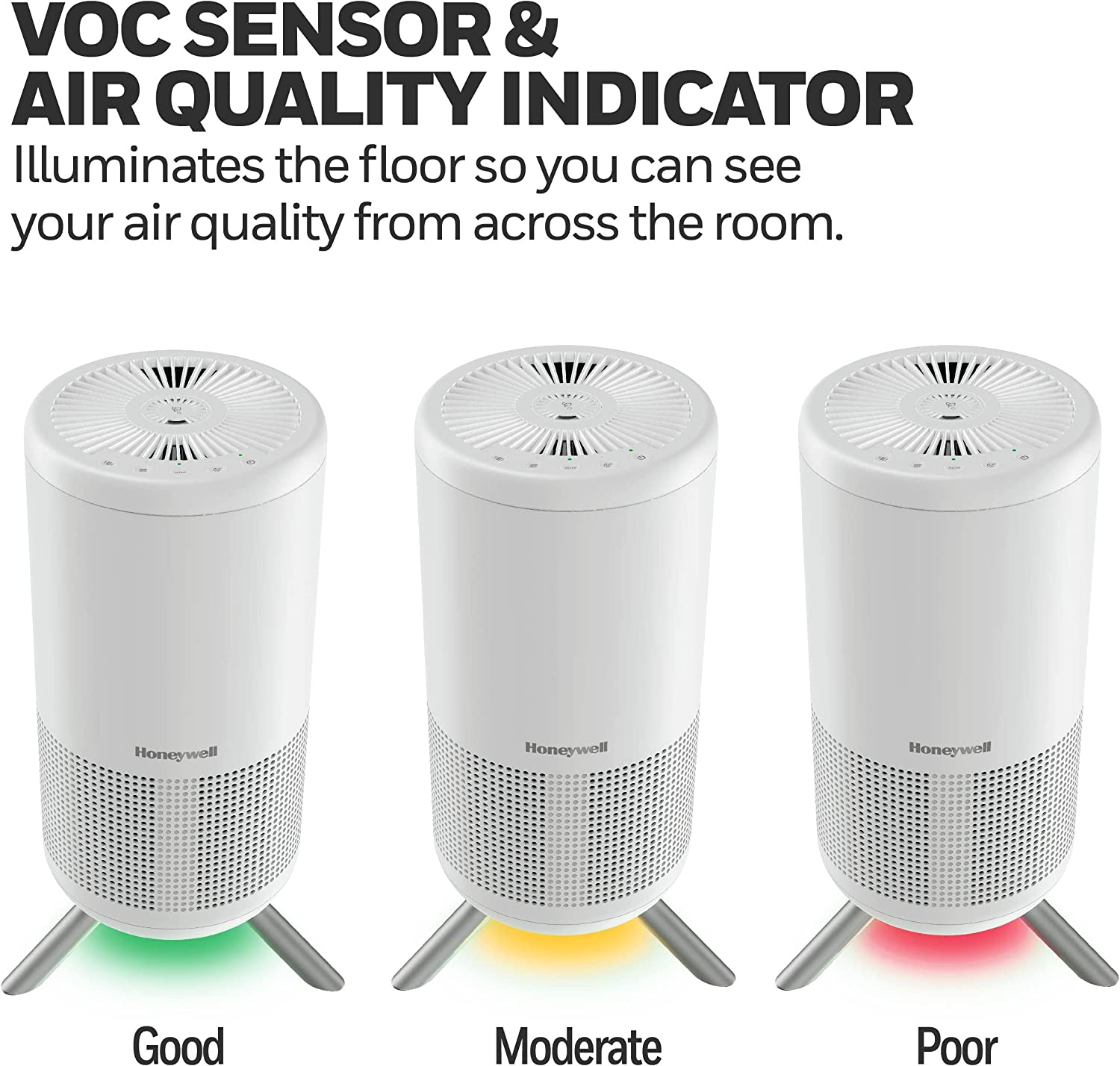 • AIR QUALITY DISPLAY – This Honeywell Air Purifier features a VOC Sensor and Air Quality Indicator that illuminates the floor so you can see air quality from across the room. Automatic Cleaning Mode adjusts to the optimal cleaning level for cleaner air.