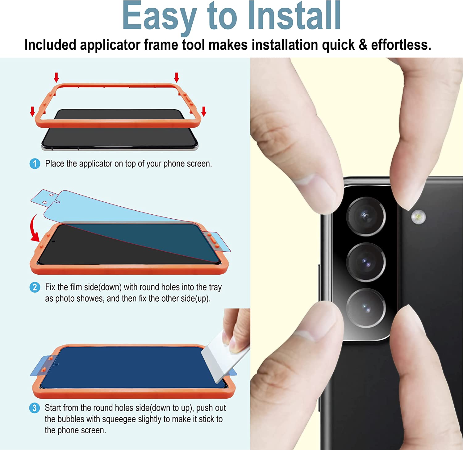 - 【Packaging includes】3 screen protectors, 2 camera lens protector, 5wipes, 5 cleaning cloths, 5 dust removers,1 installation guide,1 Installation tool, 1 non-slip mat.