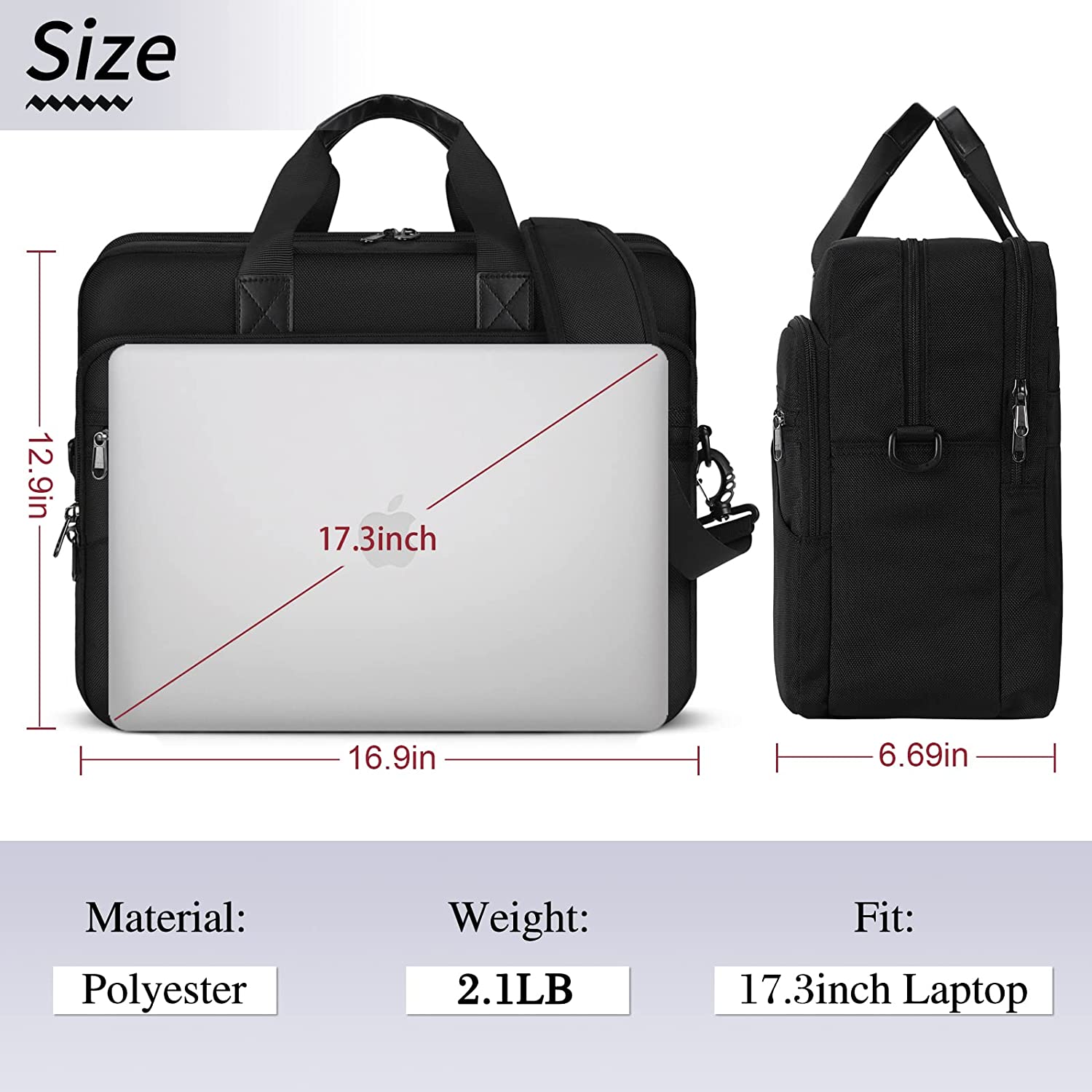 - ?【Perfect 17.3inch Business Briefcase】The size of laptop bag is 16.9 x 6.69x 12.9in(L x W x H). Weight:2.1LBS. Separate padded laptop compartments hold tablet and most laptops up to 17.3 inch like HP/MacBook Air/Microsoft Surface/Dell/ASUS etc., offering enough space and great protection. The appropriate laptop briefcase size is specially designed for business, it can keep your office items like paper, documents well organized when you are facing a situation where you need to attend a meeting.