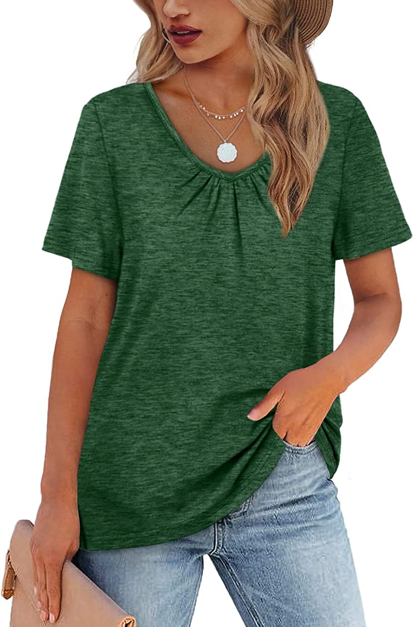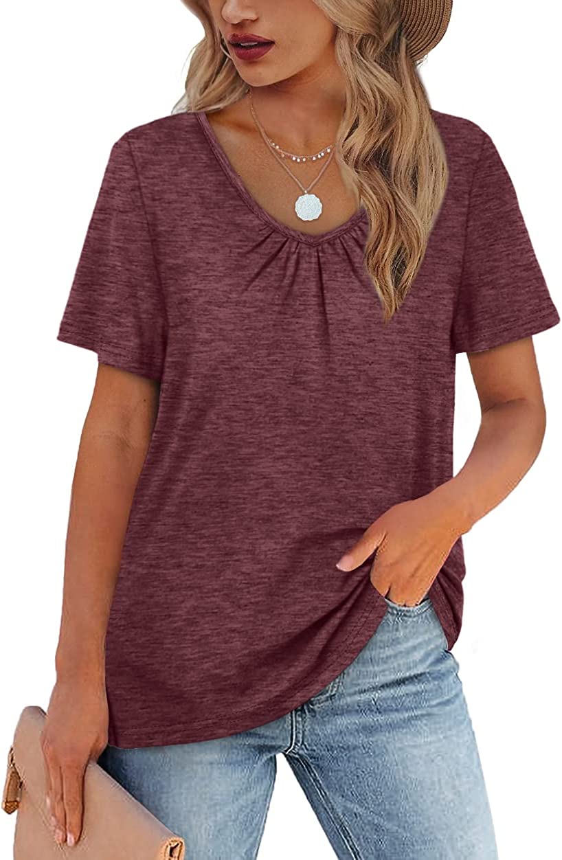 WIHOLL Women's Shirred V-Neck T-Shirts Short-Sleeve Casual Summer Tops