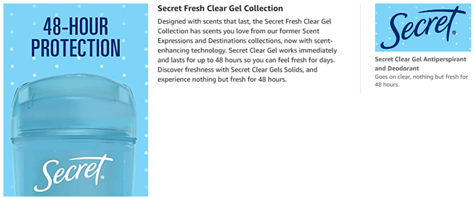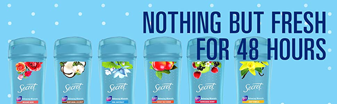 Designed with scents that last, the Secret Fresh Collection has scents you love. Secret Antipirspirant and Deodorant for Women Fresh Clear Gel immediately fights odor and provides 48-hour sweat and odor protection, helping you stay fresh and confident day in and day out. Secret’s unique clear gel formula goes on clear, dries fast, and provides a burst of freshness that lasts all day long. Secret Fresh Clear Gel with pH Balancing Minerals is nothing but fresh for 48 hours.
