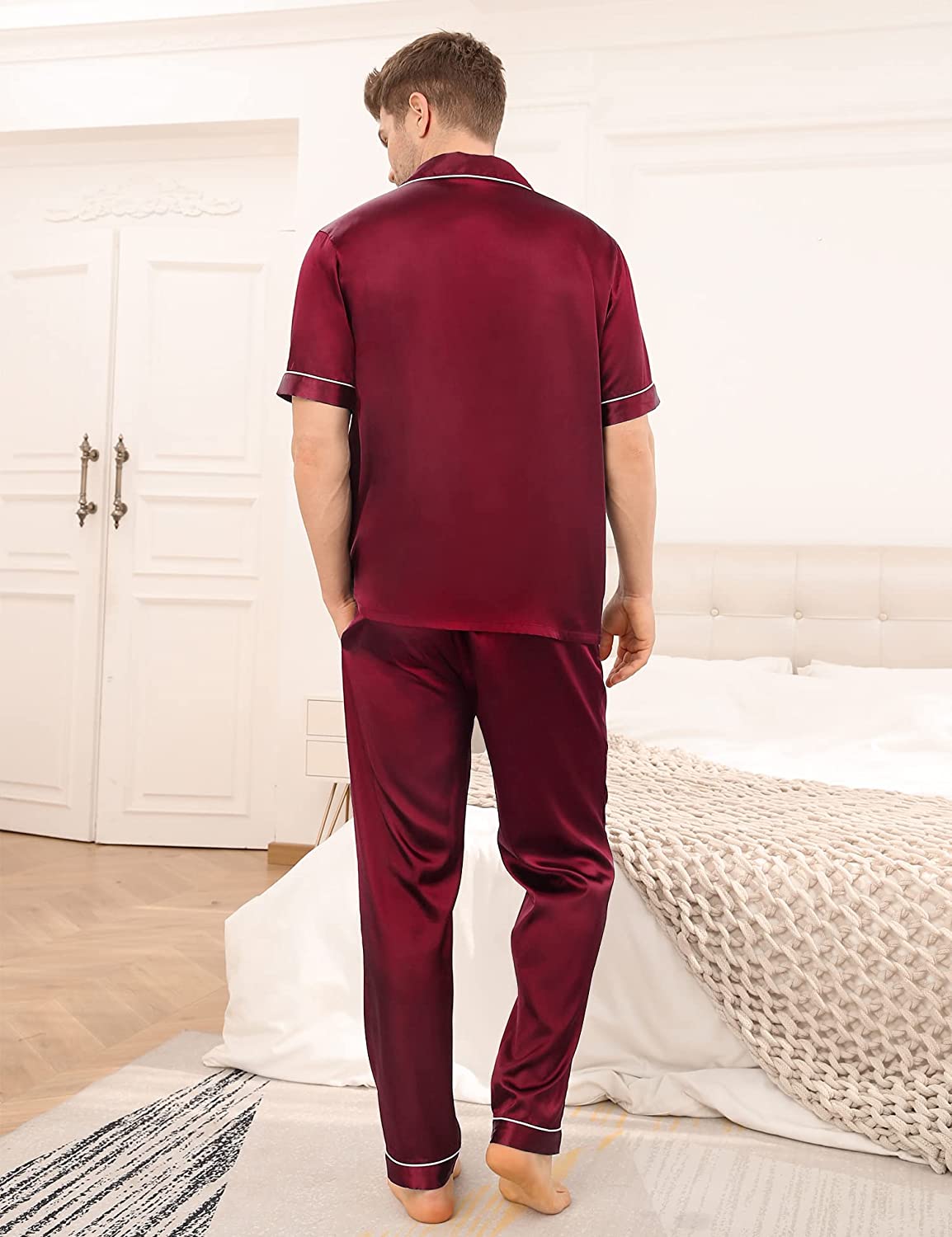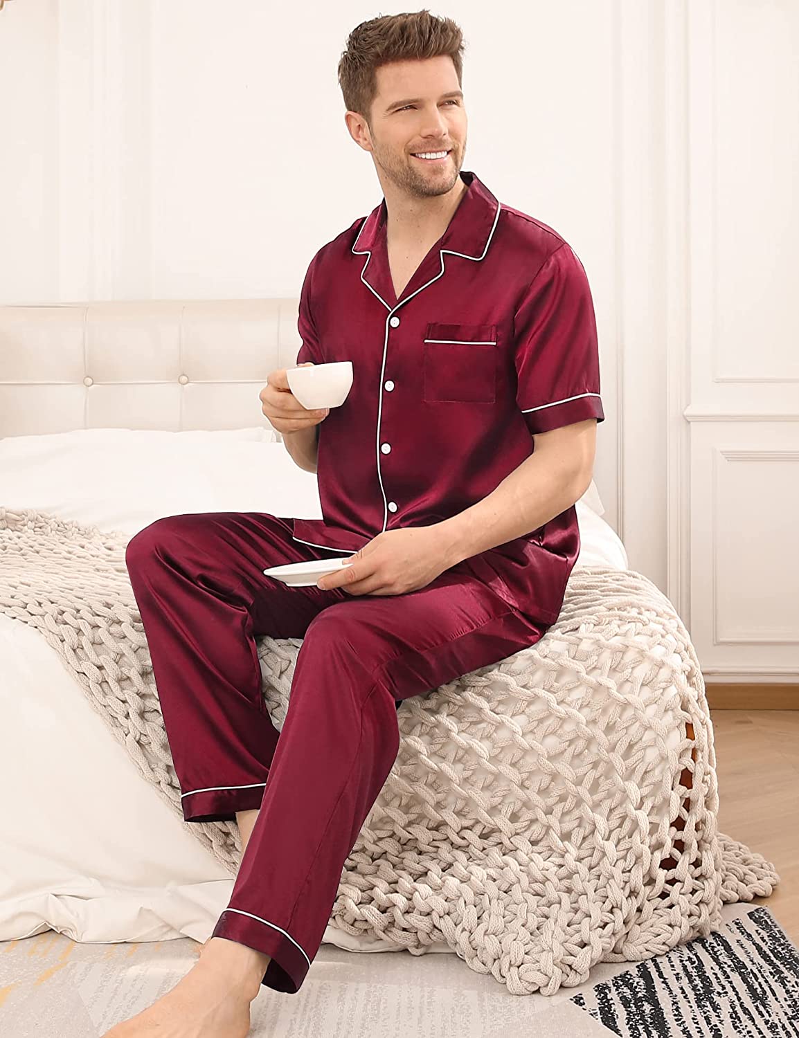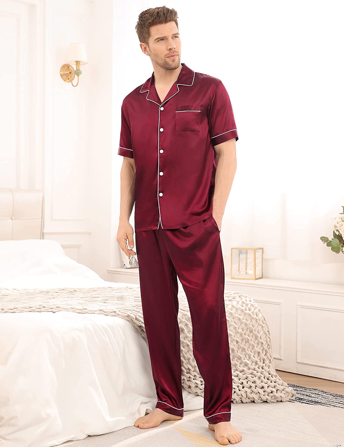 - GREAT AS A GIFT: Men's silk pajamas with high-quality silky fabric with a soft and natural shine, Great Choice for your dad, husband, son, brother, and boyfriend as a Birthday gift. Great Present for New Year, Valentine's Day, Christmas Day, Wedding Party Gifts, Honeymoon Vacation, or other Festivals or Anniversaries