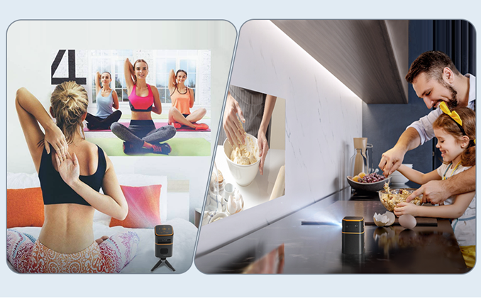 This is a mobile projector with a compact design, almost like a 330ml water tank, and a body of only 390 g. This battery powered projector has a built-in high-capacity battery for long time use. For videos, they can be watched for 2.5 hours. For music, it can play continuously for about 6 hours.