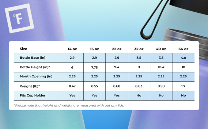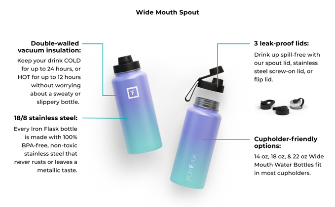 - INSULATED SPORTS WATER BOTTLE: Goodbye sweat! The double wall insulation makes the Iron Flask sweat-free! It keeps your drink COLD for up to 24 hours, and HOT for up to 12 hours. *NOTE: ONLY the 14 Oz, 18 Oz, & 22 Oz fit in cupholders*