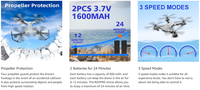 ROVPRO Drone with camera for adults has the follow me mode.The camera with 120° wide-angel viewing and 90°adjustable angle can easily take photos from various angles.