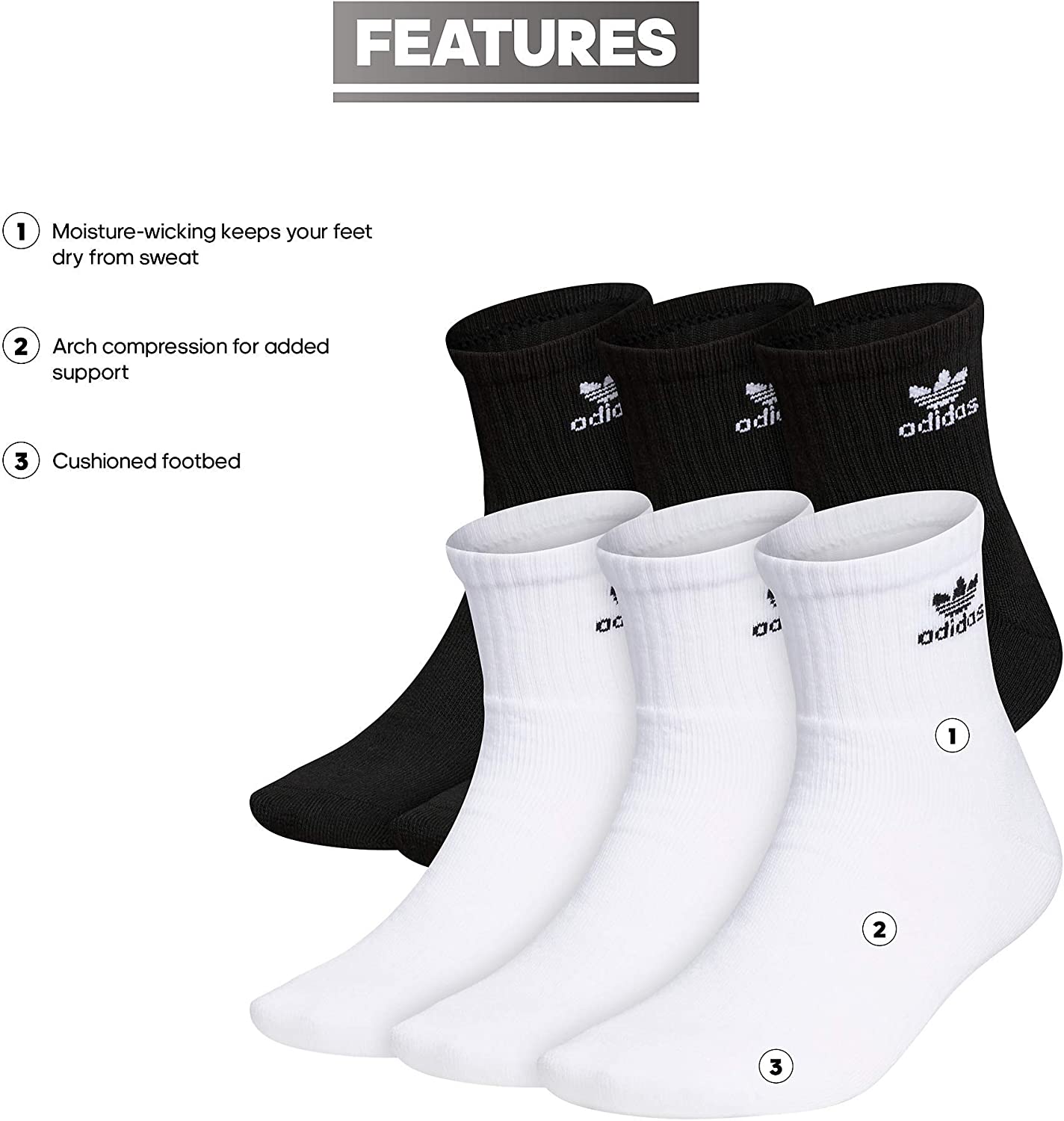The trefoil quarter is all about clean, comfortable style. cushioning in the foot gives you the comfort and durability for everyday wear, arch compression will keep the sock snug and secure on your foot, and moisture-wicking will keep your feet dry from sweat.