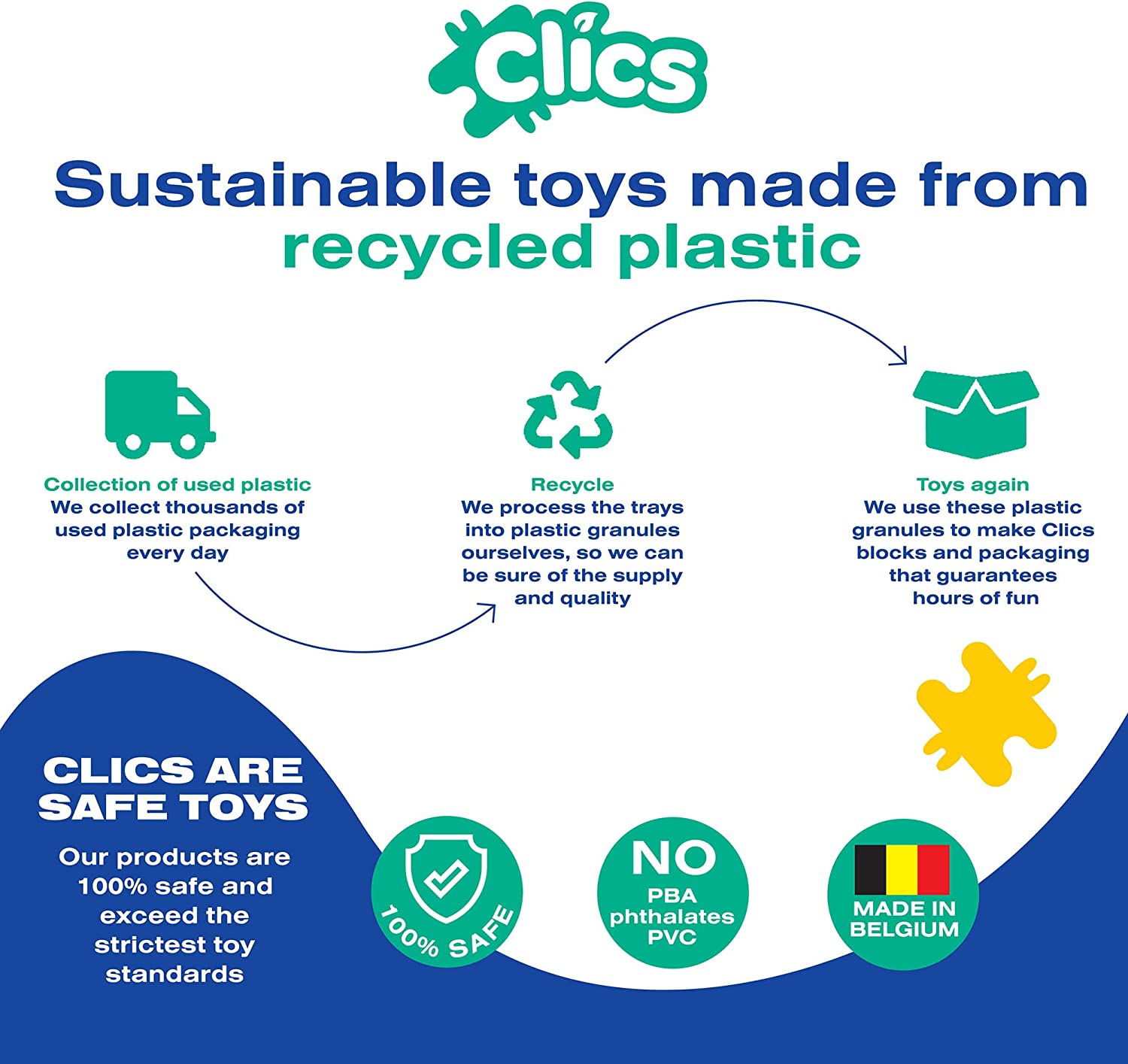 PREMIUM QUALITY - Clics are super strong, safe and durable toys. Our toys are also conform to CE, ASTM and EN71. Therefore our toys are safe for children ages 3 years and up. Clics is not only produced LOCALLY IN BELGIUM, but is also made with RECYCLED PLASTIC (both the Clics blocks and the plastic packaging). In this way, Clics Toys lowers its CO₂ footprint with 90%- we are committed to continue to look for solutions in the future to reduce the ecological burden on our planet.