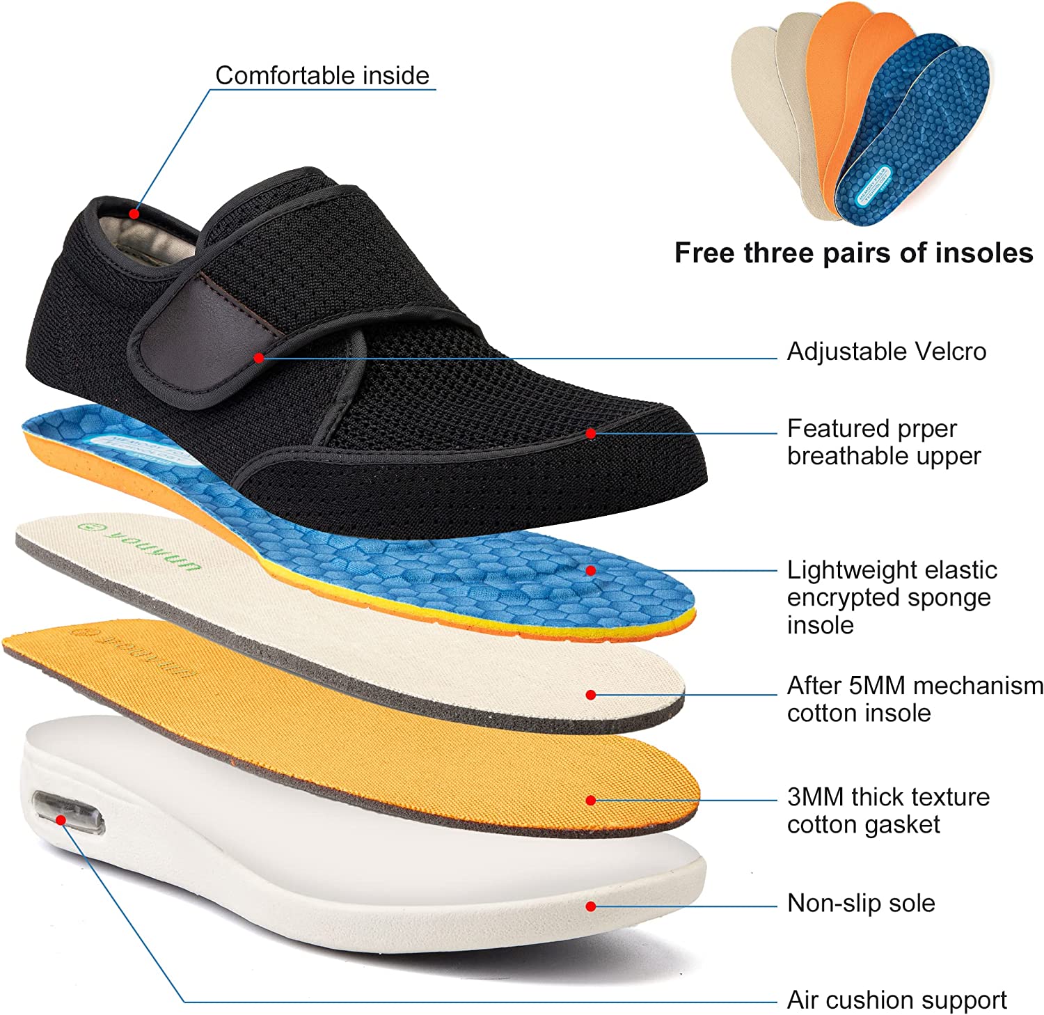• 【Comfortable Swollen Feet Shoes】 : The diabetic shoes for men have a unique velcro design, free adjustment for different instep height. The lining can be pulled to the toes, so that your swollen feet can easily wear into the shoes, perfect fit for edema and swollen feet.