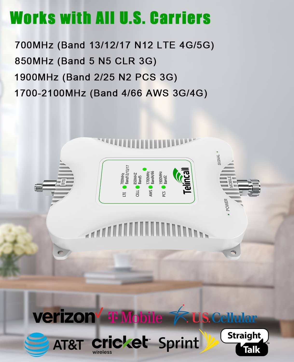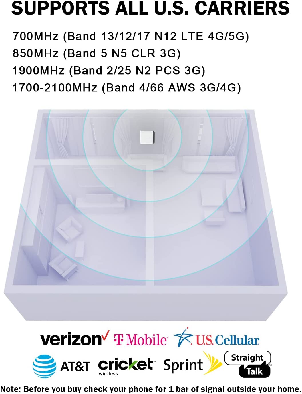 Cell booster for home works for Verizon, AT&T, Sprint, Straight Talk, T-Mobile, U.S. Cellular. Cell signal booster for home is professional designed for 700MHz Band 13/12/17 4G LTE 850/1900MHz 3G PCS 1700/2100Mhz Band 4 AWS Band 2/5/25 5G N2/N5/N12.