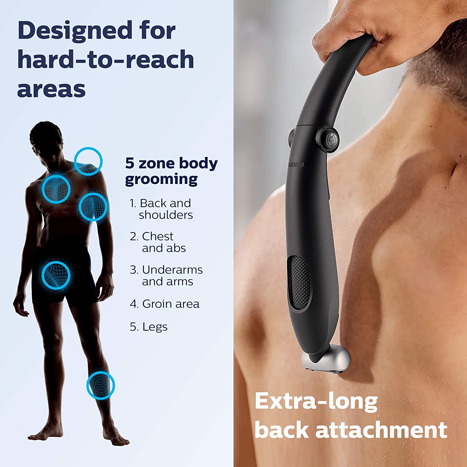 - Shave or trim any area on your body, including hard to reach areas like your back, shoulders, chest, abs, underarms, arms, groin area and legs using the extra long attachment.