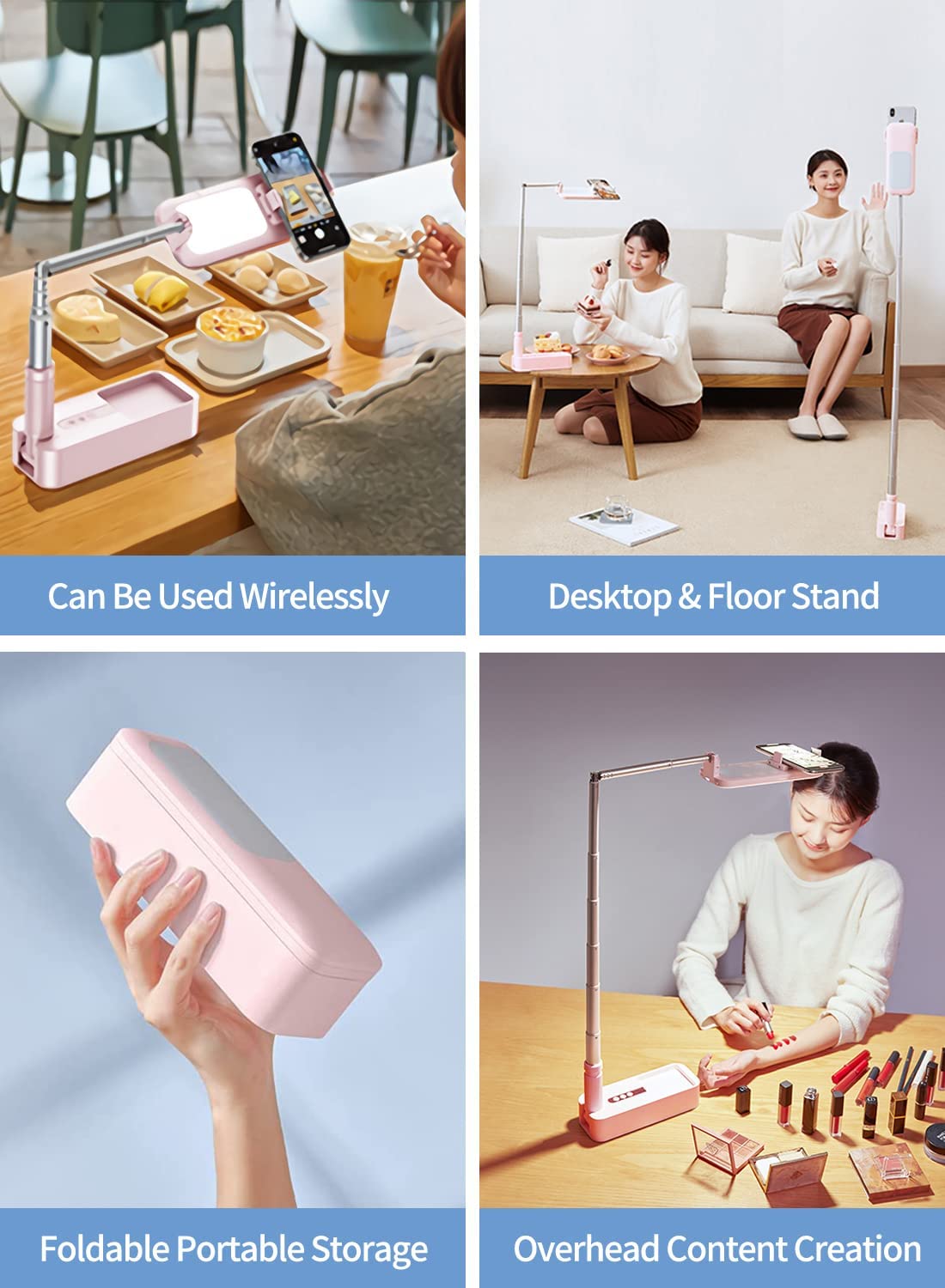 yAyusi Phone Stand for Recording,360° Rotation with Selfie Stands and Phone Holders,Overhead Phone Mount,1000mAh Battery Operated 7 Brightness LED Light for Live Streaming/Video Recording (White)