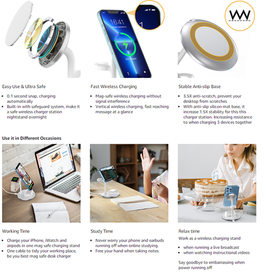 - 【Power in 1s Snap】: Built in with dedicated magnets, the wireless mag safe charger stand provide precise mag safe alignment for your electronic devices. Solid wireless magnetic connection ensures the convenience and security of charging and holding your devices in any orientation portrait or landscape.
