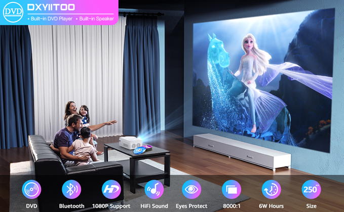The Dxyiitoo projector With Built in DVD player, you can play the disc without additional DVD player. The large screen provides you and your family to enjoy a wonderful home theater experience. It supports direct playback of CD, DVD, CD-R/RW, DVD-R/+R, DVD+RW/-RW, VCD, SVCD (but not Blu-ray DVD), and There is no limit on your disc choice and maximize visual and auditory experience.
