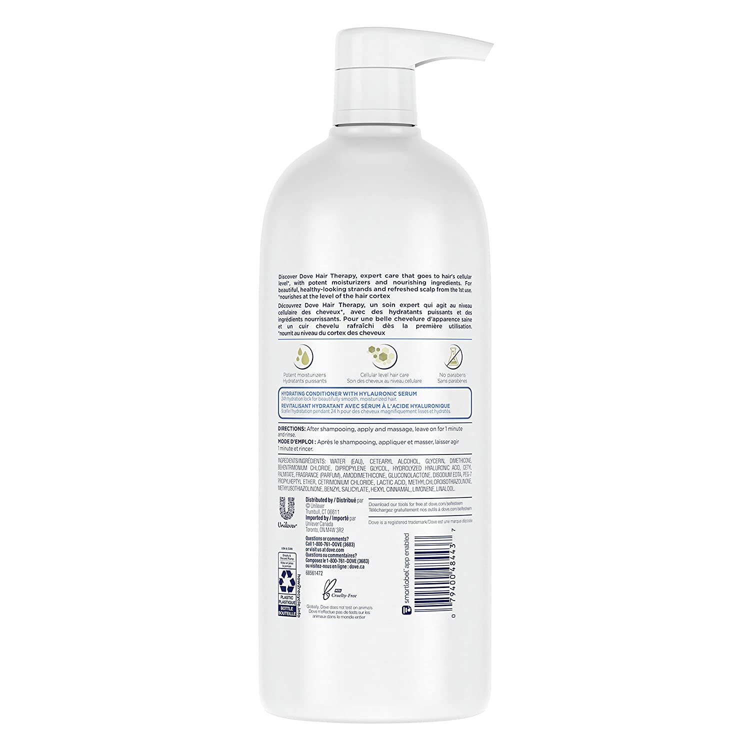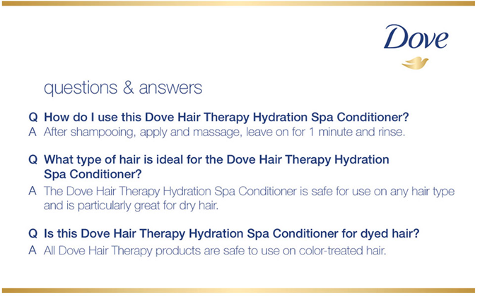 If you’re searching for smooth, moisturized hair, look no further. After using our Hair Therapy Hydration Spa Shampoo, treat yourself to a mini spa day in the comfort of your home with our Hydration Spa Conditioner for a dose of hair hydration. Specially created to give dry hair the care it deserves, this nourishing conditioner is formulated with our 24-hour hydration lock technology to keep hair hydrated for longer. Infused with hyaluronic serum, it helps to give you a boost of hair hydration and leaves you with healthy-looking locks wash after wash, when used with our Hydration Spa Shampoo. Plus, it’s infused with potent moisturizers and nourishing ingredients that target your hair on a cellular level* – leaving it soft, smooth and beautifully hydrated. And that’s not all, it leaves your scalp feeling refreshed and vitalized, too. Simply smooth this hydrating conditioner on after using our Hydration Spa Shampoo and enjoy a spa-like treatment every time you shower. Perfect for: Expert hair care : Dreaming of a smooth hair conditioner that can work wonders? This hair smoothing conditioner blends all the care of Dove with expert know-how to nourish your hair at a cellular level* with potent moisturizers and nourishing ingredients. Hair hydration: Formulated with hyaluronic serum, this hydrating conditioner uses our 24-hour hydration lock technology to keep hair hydrated all day long, when used alongside our Hydration Spa Shampoo. A spa-like experience: Wondering how to make hair look healthy? Treat it to a spa-like experience. This gentle, paraben-free conditioner for dry hair works to leave you with nourished, healthy- looking hair and a refreshed scalp – all from the comfort of your home. Cruelty-free hair care: Globally, Dove does not test on animals. Our Hair Therapy Hydration Spa range carries the PETA cruelty-free logo for added peace of mind. How to use: After shampooing with Hair Therapy Hydration Spa Shampoo, apply this hydrating conditioner from the mid lengths to tips and massage it in. Take a moment to enjoy your conditioner (for smooth hair and a spa-like experience leave it on a little longer), then rinse away. *Nourishes at the level of the hair cortex
