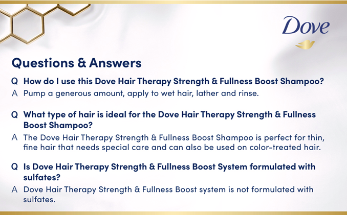 • Use Dove Hair Therapy Strength and Fullness Boost Shampoo to nourish and soften hair from the first use