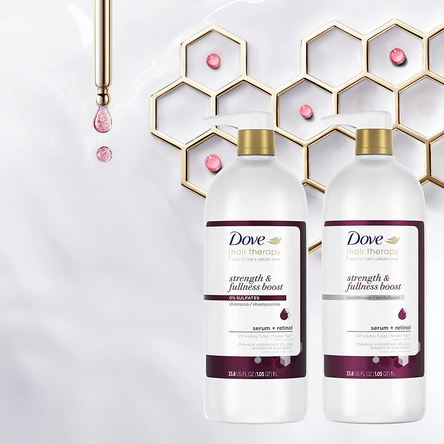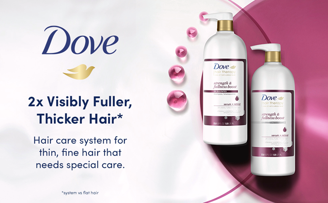 Perfect for fine hair that deserves extra care. Dove Hair Therapy Strength & Fullness Boost Shampoo and Conditioner System is designed with serum and retinol, which strengthen hair from root to tip and instantly restore hair fullness. This sulfate-free system features potent moisturizers and nourishing ingredients that deliver 2X visibly fuller, thicker hair*.