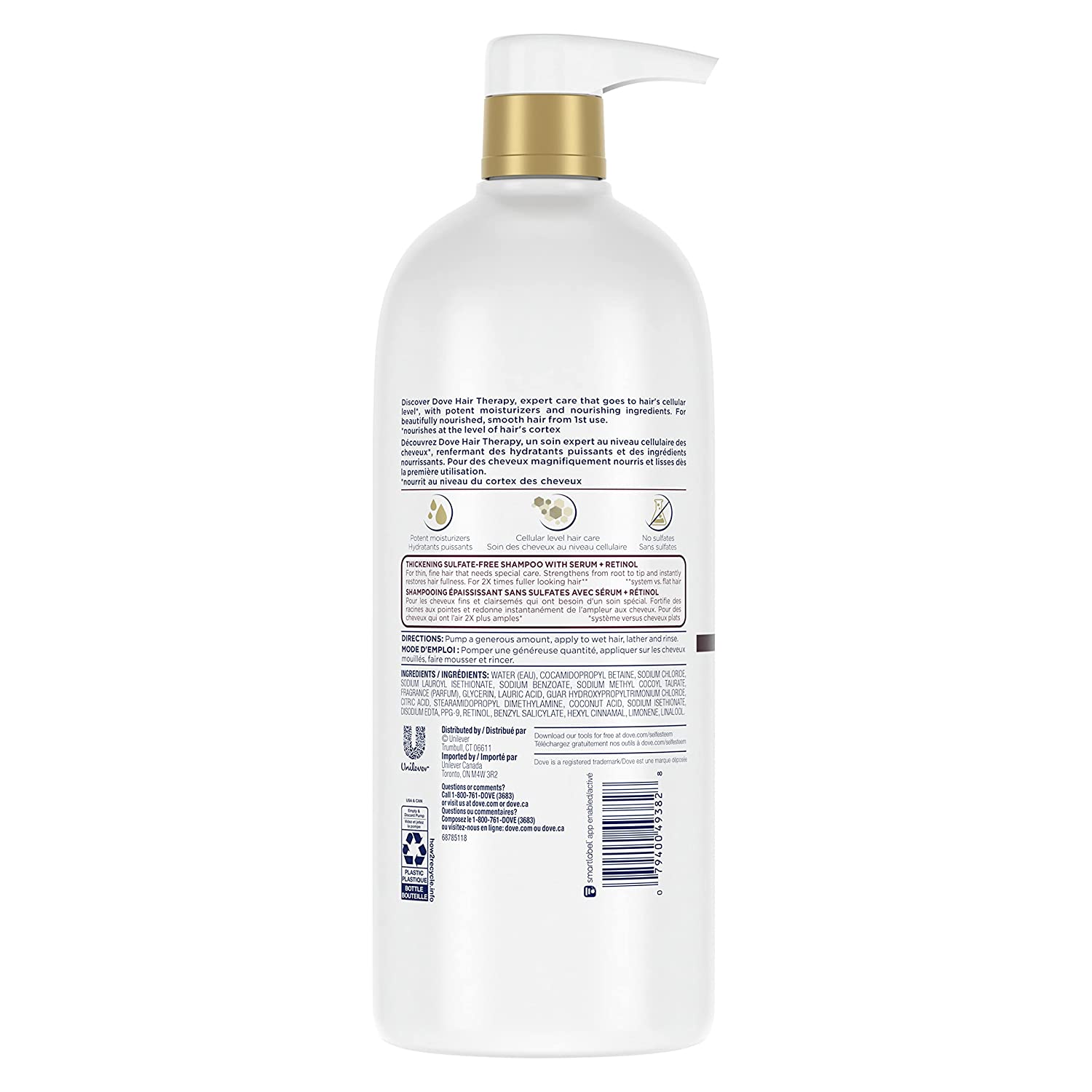 Get ready to get 2X visibly fuller, thicker hair* because Dove Hair Therapy Strength and Fullness Boost Shampoo isn’t your typical shampoo. This hair shampoo is formulated with serum and retinol for thin, fine hair that needs special care. This hair strengthening treatment strengthens and adds fullness to your hair, wash after wash. Dove Hair Therapy Strength and Fullness Boost is a sulfate free shampoo that features potent moisturizers and nourishing ingredients for care at the level of hair's cortex. So if you’re looking for soft, visibly nourished hair, look no further than this shampoo. While you hydrate hair with this hair thickening shampoo and conditioner system, let the potent moisturizers and nourishing ingredients restore your hair and add softness during your hair care routine from the first use. To refresh and clean hair, lather your hair with Dove Hair Therapy Strength and Fullness Boost Shampoo and rinse. Follow with Dove Hair Therapy Strength and Fullness Boost Conditioner. Unilever’s ongoing work on alternatives to animal testing for more than 30 years, and its commitment to promote their adoption globally, has been recognized by PETA, which has listed Unilever as “a company working for regulatory change.” Globally, Dove does not test on animals and is certified by PETA as Cruelty-Free. *system vs. flat hair *nourishes at the level of hair's cortex.