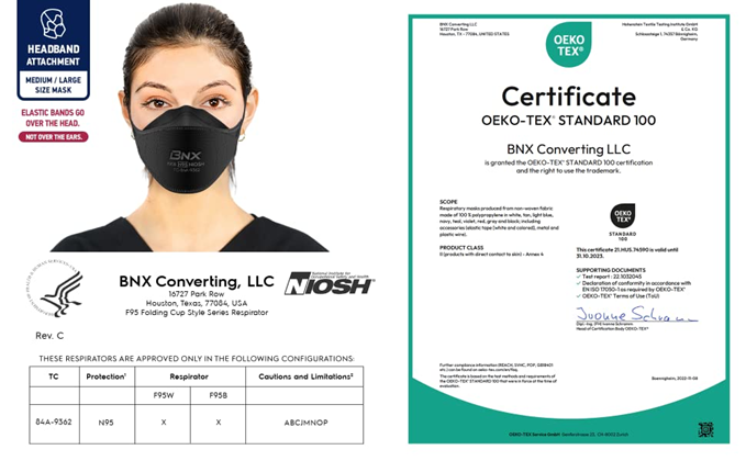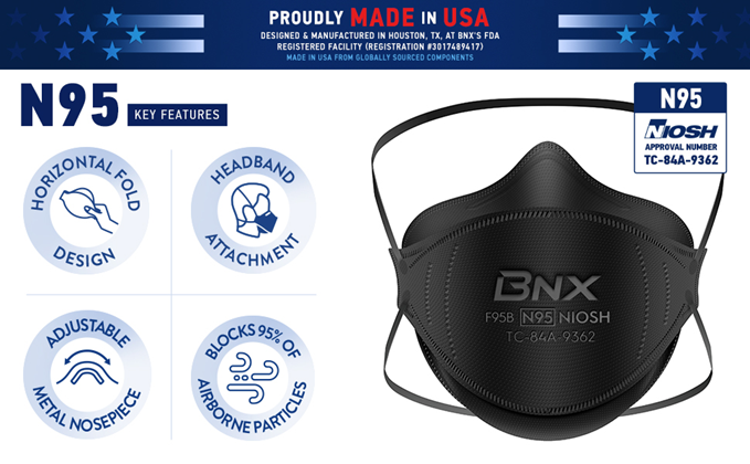 MADE IN USA – Manufactured by BNX Converting LLC in Houston TX, a NIOSH/CDC Approved and FDA Registered (Registration # 3017489417) manufacturer of N95 mask respirators.